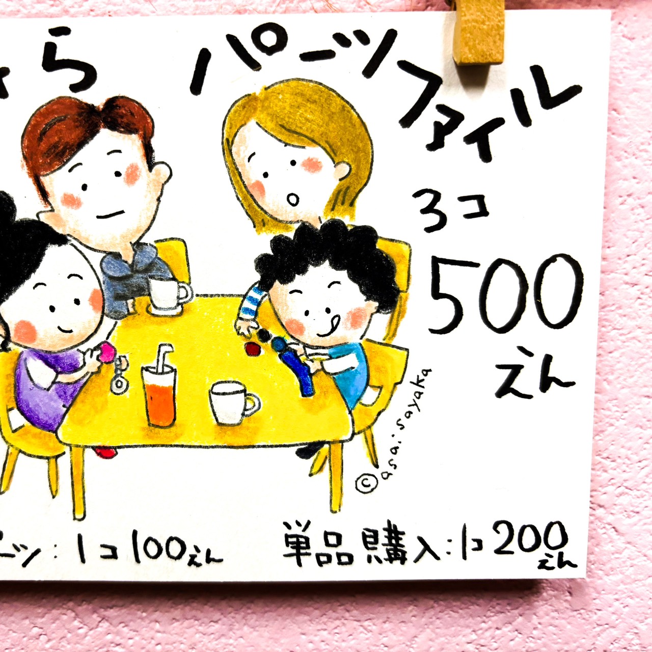 看板代わりのプレートに貼るイラストや文字を手描きで作りました。